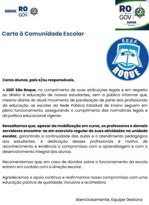 Segundo a direção regional do sindicato, uma carta emitida pela direção de uma escola em Corumbiara, supostamente orientada pela Seduc, desmerece o trabalho dos profissionais efetivos e exalta o empenho de professores temporários. A avaliação do Sintero é que se trata de uma ação deliberada para boicotar e desmobilizar o movimento grevista, sob determinação da secretária de Educação, Ana Pacini, que representa o governador Marcos Rocha. A mesma carta foi denunciada pela direção do Sintero em Espigão do Oeste.